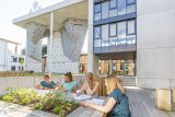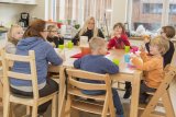Fünf Frauen sitzen an einem Tisch und schauen Dokumente an. Hinter ihnen sind durch Fenster Kletterwände zu sehen.