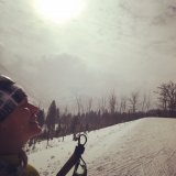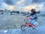 Eine Radfahrerin zeigt das Firmenlogo von Vaude auf dem Ärmel ihrer Jacke.