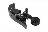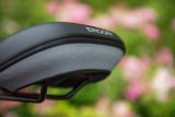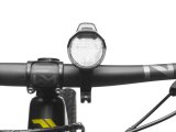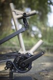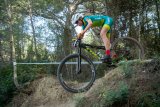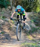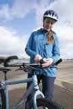 Eine Frau steht vor einem Zaun vor Bäumen und hält mit der linken Hand ein Mountainbike am Lenker.