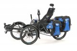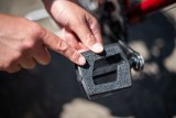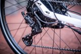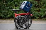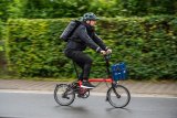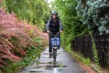 Ein Mann fährt bei Regen auf einem E-Bike durch ein Wohngebiet.