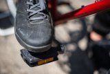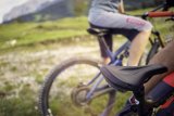 Eine Frau fährt mit einem Fahrrad auf einen Feldweg.