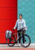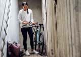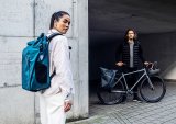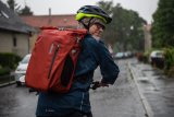 Ein Mann fährt bei Regen auf einem E-Bike durch ein Wohngebiet.