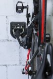 Ein Mann platziert ein E-Bike in einer Garage an einer speziellen Wandaufhängung für Fahrräder.