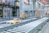 Ein Mann steht mit einem Paket in den Händen auf einem Fahrzeug zwischen zwei Hochregalen in einem Lager.