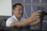 Eine Person hält ein Lot an das Knie einer Radfahrerin.