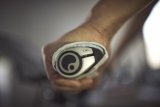 Eine Frau mit Fahrradhelm lächelt in die Kamera und ist dabei ein Energiegel zu öffnen.