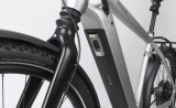 Ein E-Bike ist neben einer nassen Straße abgestellt. Im Vordergrund sitzt eine Person mit Fahrradhelm und schaut auf ihr Smartphone.