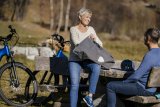 Ein Mann fährt auf einem Kompakt-Fahrrad durch die Stadt.