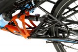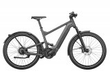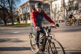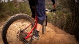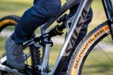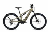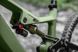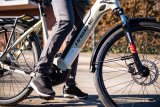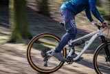 Eine Person fährt auf einem E-Mountainbike mit der Sonne im Rücken über eine Waldlichtung.