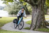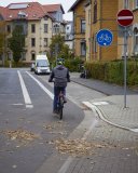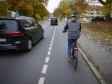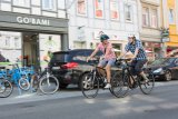 Zwei Personen fahren auf Fahrrädern in einer Großstadt auf die Kamera zu.