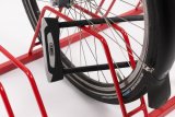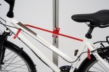Ein Mann setzt einen Bolzenschneider an einem Bügelschloss an, mit dem ein Fahrrad an einem Metallpfosten gesichert ist.