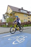 Ein Radfahrer steht an einer Ampel, die gerade umschaltet.