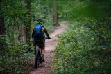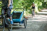 Zwei Kinder in einem Fahrradanhänger.