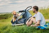 Eine Person hält Schnipsel von Kunststoffabfällen vor sich und trägt über der Schulter hängend eine Fahrradtasche.