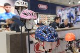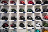 Eine Person präsentiert einen Fahrradhelm in Neongelb.