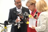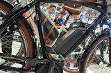 Ein Kind mit einem Laufrad vor einem Mann mit einem historischen Laufrad aus Holz.