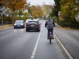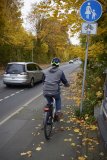 Zwei Personen fahren in dieselbe Richtung auf Fahrrädern durch die Stadt ? eine auf der Fahrbahn und eine auf dem geteilten Fuß- und Radweg.