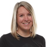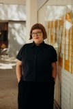 Eine Frau steht neben einem Lastenrad am Eingang einer innerstädtischen Einbahnstraße und zeigt auf das Verkehrsschild dazu. Ihr Fahrradhelm hängt am Lenker.