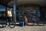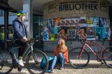 Ein Mann auf einem E-Bike mit Anhänger und eine Frau auf einem Rennrad fahren nebeneinander einen gepflasterten Weg entlang.