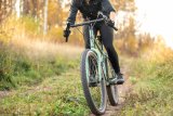 Eine Frau und ein Mann schieben ihre Mountainbikes im Wald einen Weg bergan.