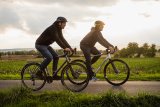 Eine Person schließt das Ladekabel an ein E-Bike an.