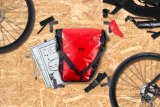 Eine Person schneidet mit einem Arbeitsmesser und einem Metalllineal Materialien einer Fahrradtasche.