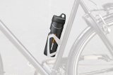 Ein Person verstaut einen länglichen Gegenstand in einer Transportbox, die ähnlich einer Trinkflasche am Fahrradrahmen angebracht ist.