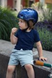 Ein Kind nimmt etwas aus der Hand eines Mannes, der vor ihm hockt. Beide tragen orange Fahrradhelme.