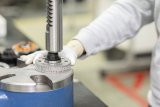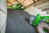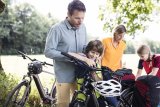 Eine Person hält Schnipsel von Kunststoffabfällen vor sich und trägt über der Schulter hängend eine Fahrradtasche.