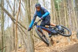 Eine Person fährt auf einem E-Bike einen felsigen Weg im Wald hinab.
