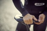 Abperlende Wassertropfen auf der Schulterpartie einer Jacke eines Radfahrers.