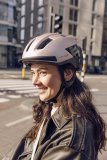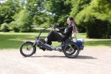Eine Frau fährt auf einem E-Bike vor einem Gebäude entlang, vor dem ein rundes Schild mit einem weißen S auf grünem Grund steht.