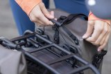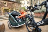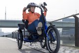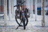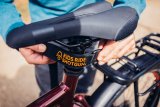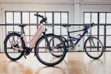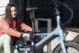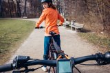Eine Frau fährt auf einem E-Bike auf einer Radspur durch die Stadt.