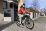 Eine Frau fährt auf einem E-Bike vor einem Gebäude entlang, vor dem ein rundes Schild mit einem weißen S auf grünem Grund steht.