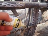 Mountainbike steht vor Wasserfall.