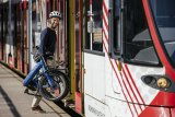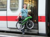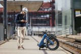 Eine Frei steigt mit einem E-Bike mit kleinen Rädern in einen Zug ein.
