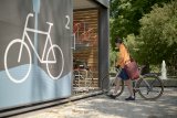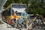 Zwei Personen schieben Fahrräder mit Gepäck daran von einem Zug weg.