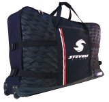Eine offene Tasche mit einem Fahrrad in Einzelteilen darin.