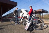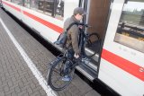 Zwei Männer stehen mit E-Bikes an einem Bahnsteig vor einem weiß-roten Fernverkehrszug.