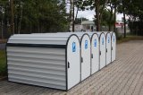 Ein Lastenrad mit einem Faltrad auf der Ladefläche, abgestellt am Rande einer großen Stellfläche für Fahrräder.