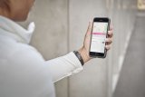 Blick über die Schulter eines Mannes, der auf ein Smartphone schaut. Im Hintergrund steht ein E-Bike vor einem Gebäude.