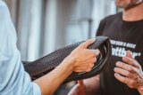 Eine Frau hinter einem Tresen nimmt alte Fahrradreifen entgegen, die ihr ein Mann reicht. Im Vordergrund steht eine Kiste mit Altreifen.