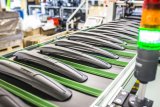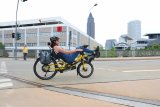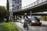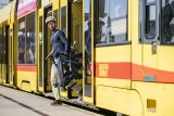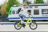 Ein Mann fährt auf einem E-Bike durch die Stadt. Im Hintergrund: eine weiß-blaue Straßenbahn.
