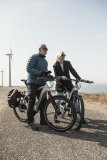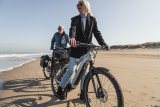 Ein Mann und eine Frau fahren auf E-Bikes einen Radweg vor einer Sanddüne entlang.