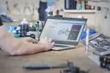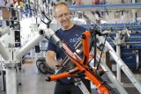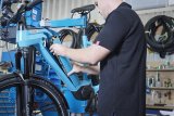 Eine Person schließt das Ladekabel an ein E-Bike an.