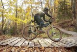 Ein Junge überquert auf einem Fahrrad eine Kreuzung.