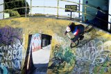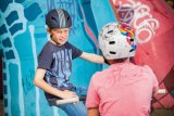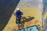 Ein Kind auf einem BMX-Rad vor Graffiti.