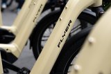 Eine Person schließt ein Ladekabel am Rahmen eines E-Bikes an.