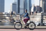 Frau fährt mit Lastenrad in der Stadt