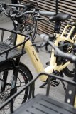 Ein E-Lastenrad in einem Park, halb im Bild.